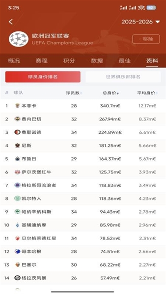3、以直观方式呈现球队排名、球员身价榜,搭配赛况数据图表,让信息查看更高效。