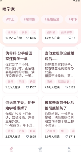 嗑学家手机版专为喜欢女频的用户打造的小说阅读软件,涵盖了多种题材,在零碎时间内快速享受各种情感故事,满足不同的阅读需求。在现实与虚构之间自如切换,极大丰富了日常生活的情感体验。汇集了海量超短篇“做梦素材”,每篇仅需几分钟,就能让你沉浸在高甜、反转、治愈或心动的故事世界中。无论是甜蜜爆表的霸总爱上我,还是温柔学长的暖心暗恋,又或是年下小狼狗的炽热追求,各种人设应有尽有,满足不同女性的爱好、每日持续更新,新故事不断涌现,时刻为你带来新鲜感。你能利用离线功能,提前缓存心仪篇章,在通勤、午休等无网络时段随时阅读。