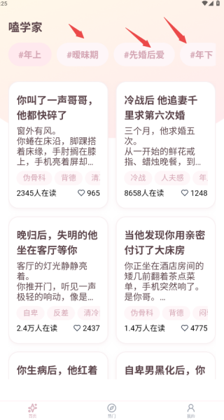 1、聚焦女性阅读偏好,主打浪漫向短篇小说,涵盖霸总、学长、年下等多元人设,精准满足不同女性的情感幻想;