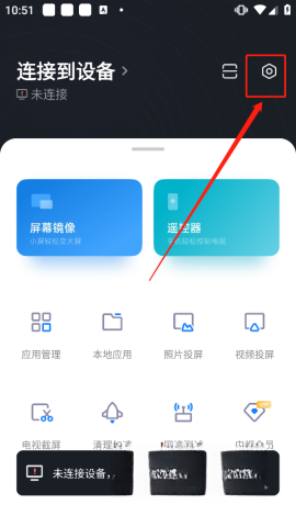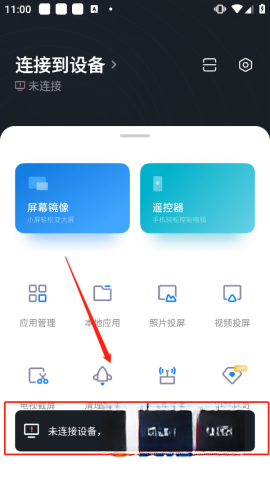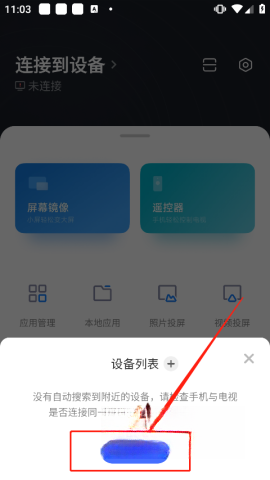 2、若手机和电视处于同一Wi-Fi环境中,点击上图所示指定位置,手机便会自动搜索并连接电视。要是未能成功连接,就需手动添加设备。