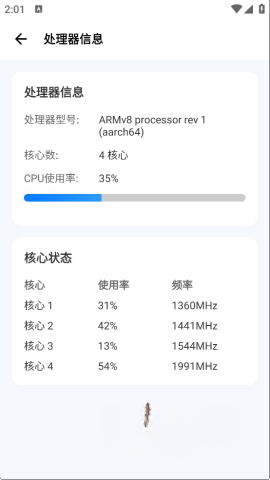 1、实时数据看板全面展示CPU核心负载、内存以及电池电量等信息。