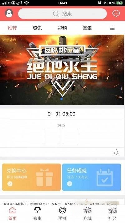 芒果电竞聚焦电竞资讯领域,其功能模块涵盖首页、赛事、预测、商城以及社区。