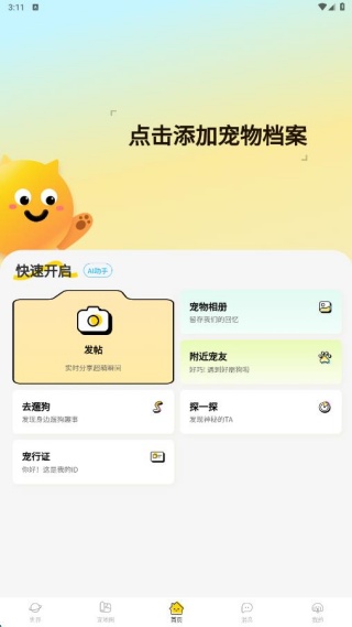 3、当你进入首页后,便可以添加你的爱宠档案,同时还能够分享宠物信息。