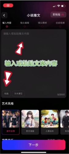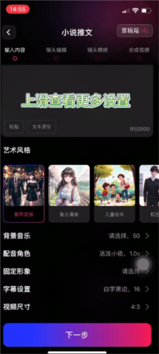 4、向上滑动屏幕,对艺术风格、背景音乐、配乐角色等进行设置,完成设置后点击“下一步”。