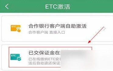 2、进入“ETC激活”界面,其中有五种激活方法,即“合作银行客户端自助激活”、“已交保证金在线自助激活”、“ETC现场办理激活”、“ETC扫码办理”以及“客户经理激活”。在此,小编选择“已交保证金在线自助激活”,原因是其他几种激活方式都能由银行工作人员协助操作。