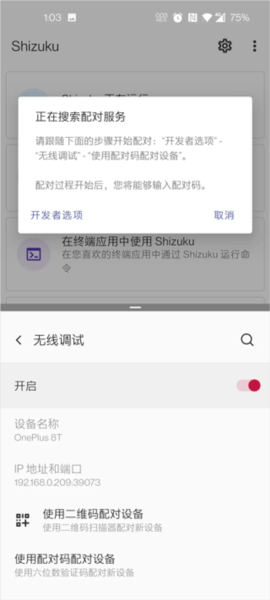 2、随后便会生成配对码,于shizuku中输入该配对码完成配对,即可激活shizuku。