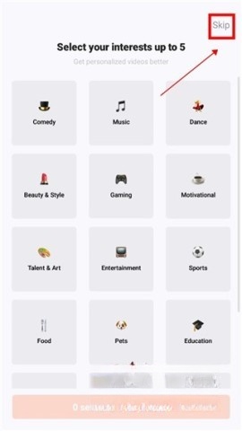 1. 第一步,打开Kwai快手海外版,进入后进行喜好设置,既能够自由挑选,也可以直接跳过。