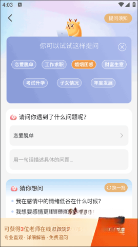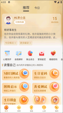 第一步,打开已在本站安装的应用,如此一来,您便能针对人格、生日、图腾、真爱测试、生日排盘等项目展开咨询。