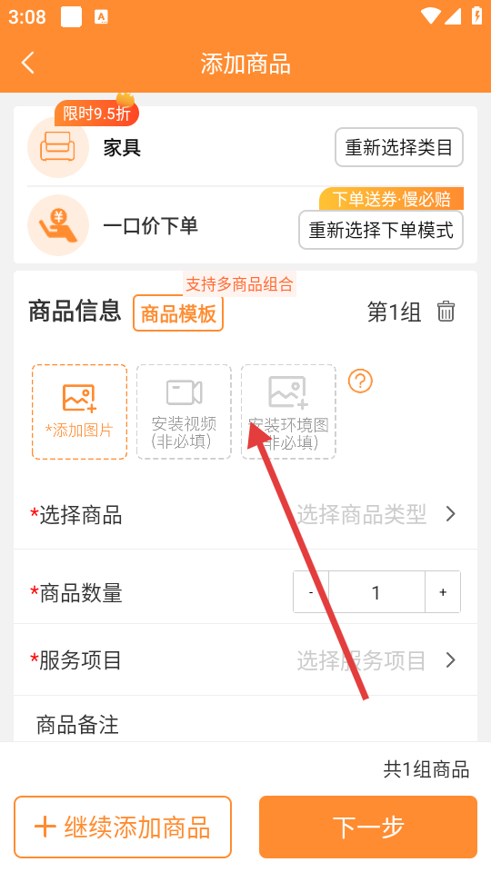 3、进入【添加商品】页面,按照自身需求上传商品相关资料,待商品信息完善后,点击【下一步】。