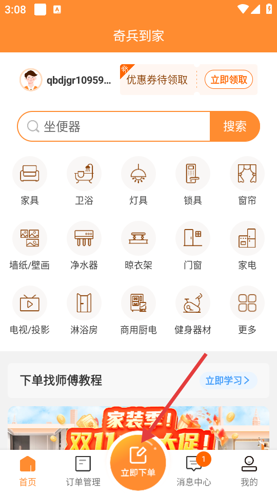 1. 于【奇兵到家】首页,点击底部的【立即下单】按钮,从而进入发布订单页面。