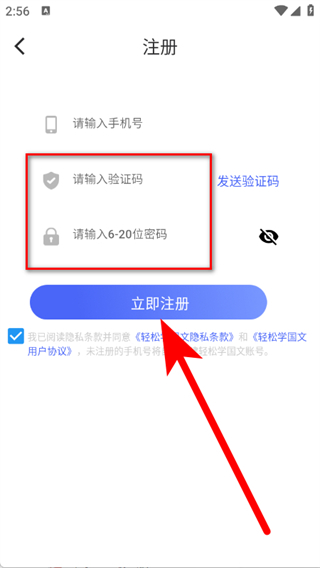 4、在相应位置输入验证码以及密码,随后点击“立即注册”按钮,即可完成账号的注册流程。