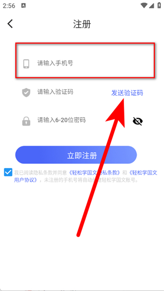 3、来到注册页面,填入手机号,接着点击“发送验证码”按钮。