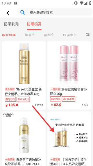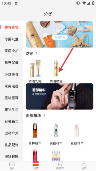 1. 来到分类页面,点击【防晒喷雾】类别,查看相关商品。