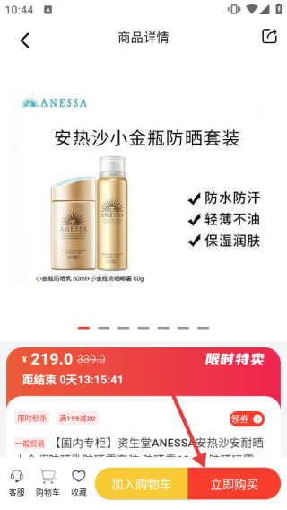 3、于商品详情页面,点击【立即购买】按钮,即可完成防晒商品的选购。