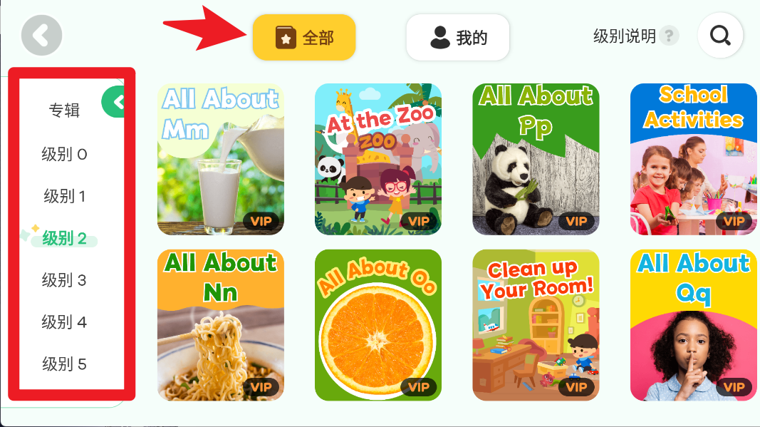 3、在图书馆页面,你能够通过左侧的筛选级别或者专辑,在右侧浏览各种分级绘本,进而从中选出适合孩子当前阶段的图书。