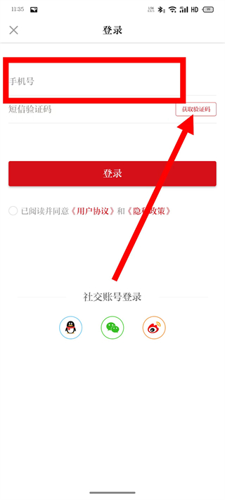 3、来到登录页面,填入手机号,接着点击获取验证码。