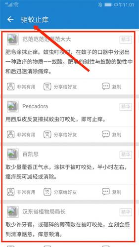 3、用户社区的分享功能中,收纳了2568条经用户验证的有效驱蚊方案,便于大家交流实用的驱蚊经验。