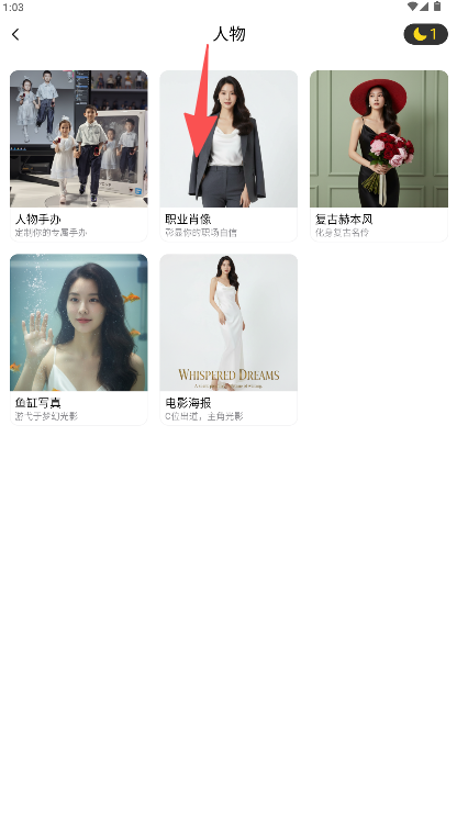 2、在人物风格模板页面进行浏览,从中挑选如“职业肖像”这类具体风格,随后进入上传页面。