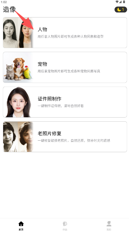 1. 首页采用四宫格的功能布局方式,清晰展示人物、宠物、证件照、老照片修复这四大核心模块的入口。