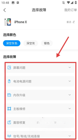2、进入故障选择界面,在故障类型中选中对应的问题,方便维修师傅准确掌握情况。