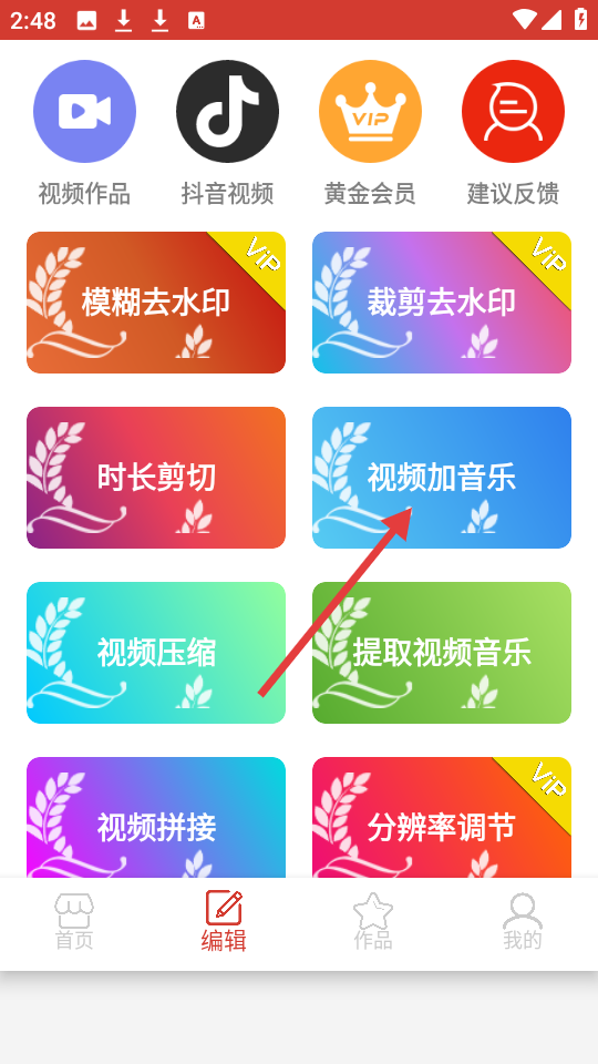 2. 在编辑界面,点击【视频加音乐】这一功能,随即进入视频选择界面。