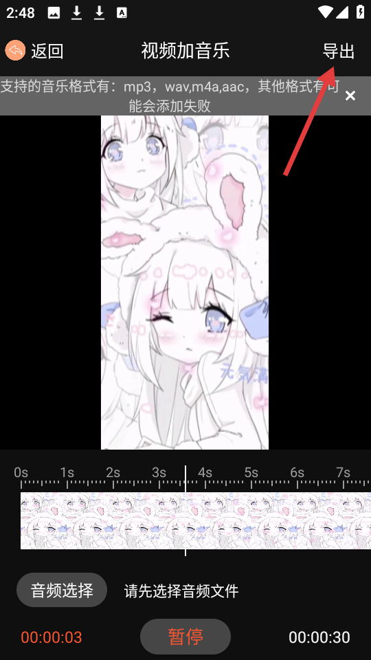4、于视频添加音乐的编辑界面完成相关操作后,点击右上角的【导出】按钮,便能导出已添加音乐的视频。