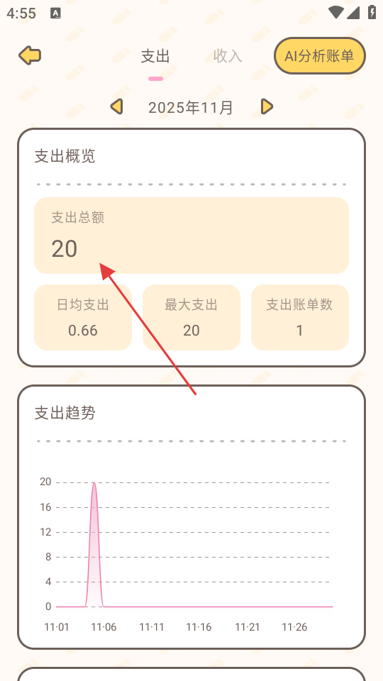 4、完成记录后,在统计界面能够查看诸如支出总额、日均支出以及支出趋势等账目分析相关信息。