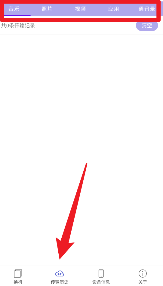2. 在传输历史页面,你可以查看音乐、照片、视频、应用以及通讯录等各类传输记录,同时还支持进行清空操作。