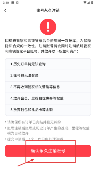 4、于账号永久注销页面,点击“确认永久注销账号”按钮,即可完成账号永久注销操作。