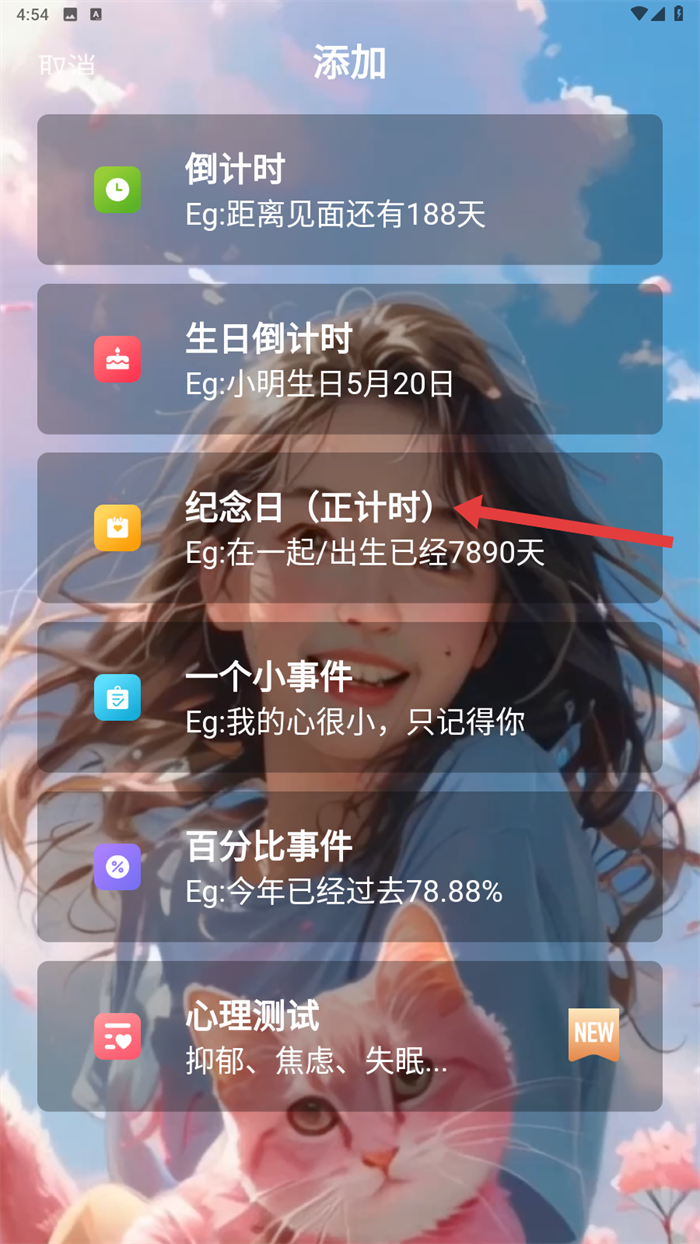 2. 在添加页面,勾选【纪念日】选项,便能进入新建纪念日的设置页面,轻松打造属于你的个性化倒计时。