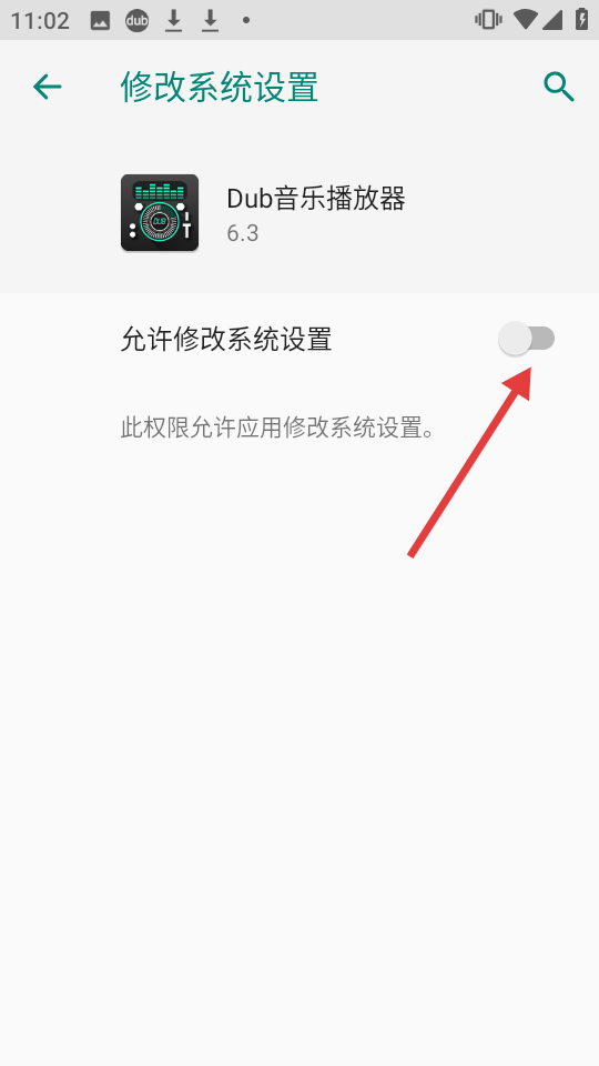 4、进入系统设置里的“修改系统设置”界面,打开【允许修改系统设置】的开关,赋予Dub音乐播放器对应的权限。