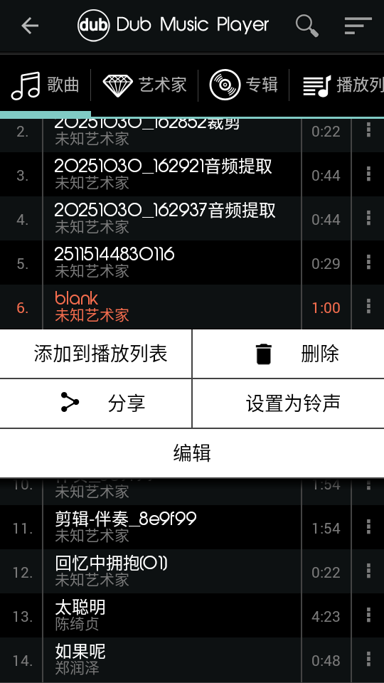 3、于展开的操作菜单里,能够选择【添加到播放列表】【删除】【分享】【设置为铃声】等操作。