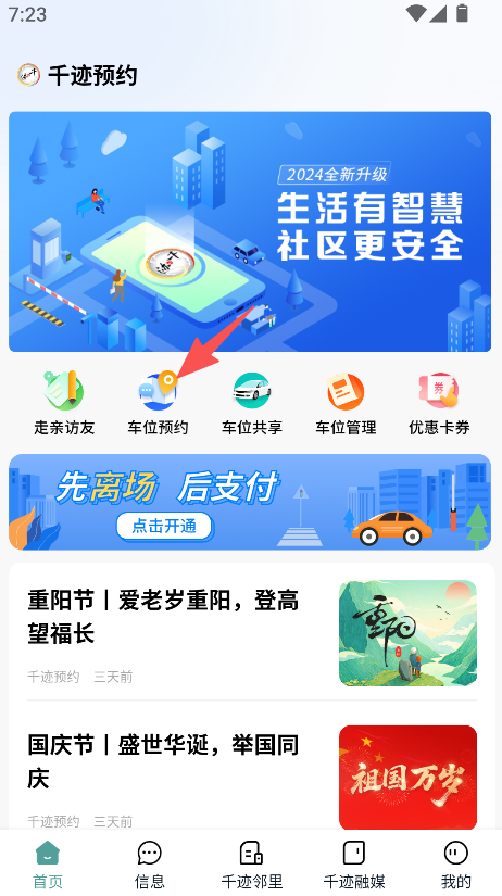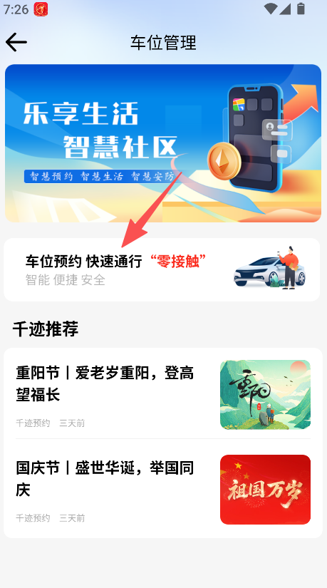 1. 打开首页,点击“车位预约”选项。