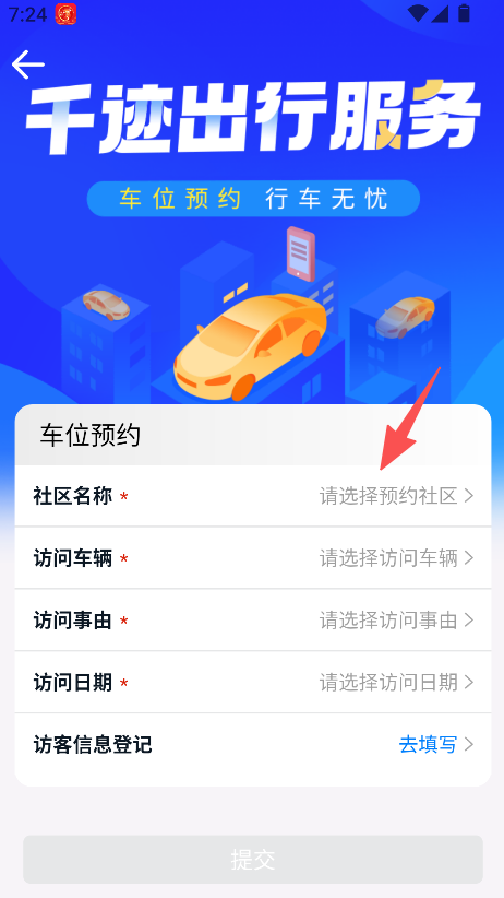 2. 依次填写社区名称、访问车辆、访问事由及访问日期,完成访客信息登记后提交。