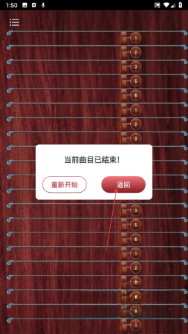 4、当曲目演奏完毕,会弹出提示框,点击【返回】按钮,就能回到曲谱选择界面。