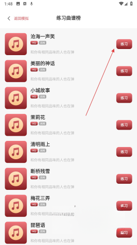 2. 在练习曲谱榜页面,挑选【喜欢的曲目】,点击右侧的【练习】按钮,即可进入该曲目演奏界面。