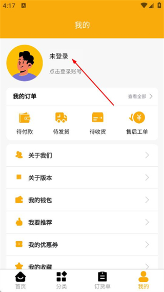 2、在个人中心页面,点击未登录,进入登录页面。