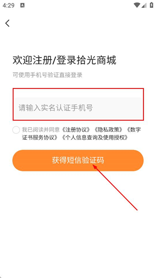 3、于登录注册页面处,填入已实名认证的手机号,接着点击获取短信验证码。