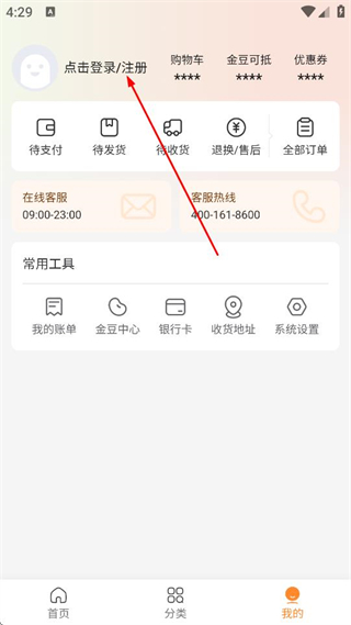 2、于个人中心页面,点击“登录/注册”,进入登录注册页面。