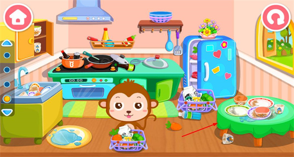 2、当处于厨房清洁场景时,若看到厨房布局杂乱且有猴子角色,点击需要整理的餐桌区域,即可进入餐具收拾环节。