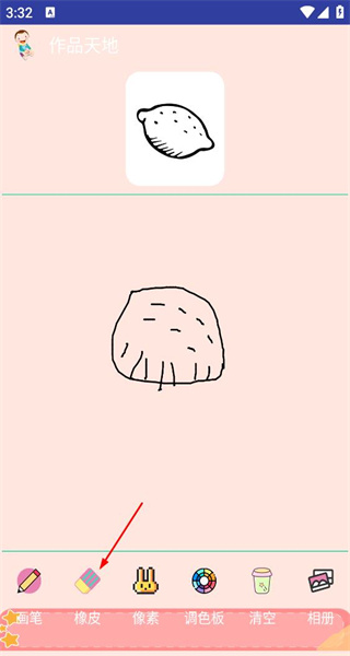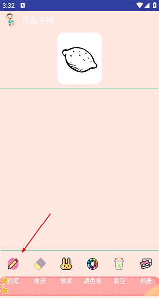 3、进入绘画创作界面后,能看到画笔、橡皮等工具选项,此时点击画笔,即可使用画笔开始绘制图案。