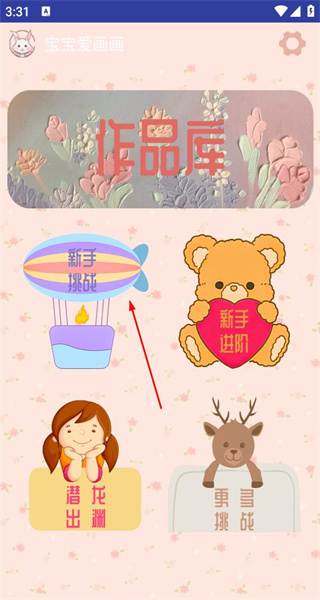 1. 打开软件,进入首页,首页呈现作品库、新手挑战等板块,点击新手挑战,随即进入绘画图案选择页面。