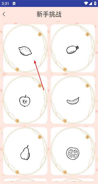 2. 在新手挑战页面,能瞧见柠檬、苹果等各式各样的图案,点击柠檬图案,即可进入绘画创作界面。