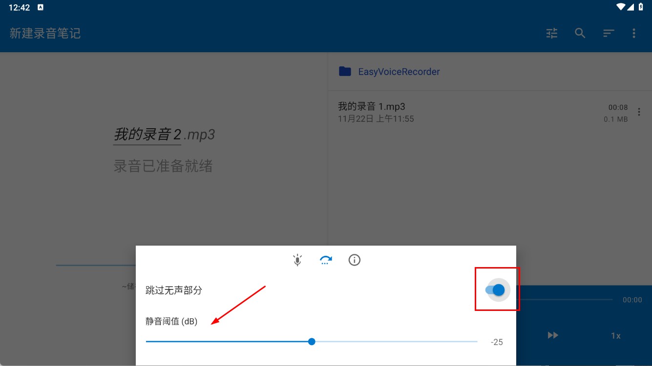 3、启用自动跳过无声部分功能,设定静音阈值dB,录制过程中自动略过没有声音的片段,使录音内容更加简洁高效。