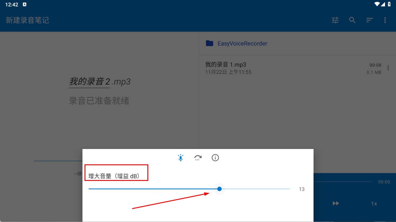 2、在录音设置中,通过调节音量增益来增大录音音量,提升会议或课程录音的清晰度。具体操作是拖动滑块,对dB值进行调整。