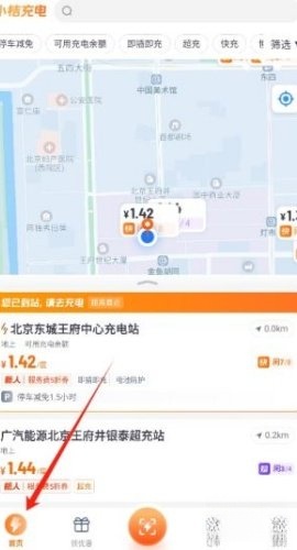 1、当你进入并开启定位功能,首页将根据你所在的定位信息,呈现附近可供充电的地点。