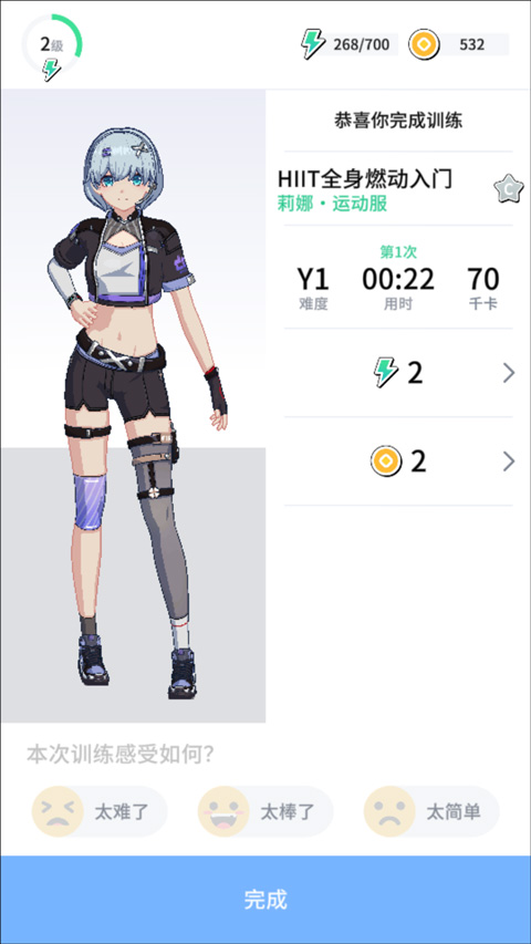 8、训练结束后,教练会夸赞你“你真棒”。此时,你还能查看训练所消耗的时间、难度以及消耗大卡的数量。