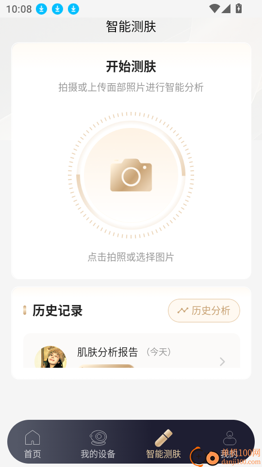 4、接着在“历史记录”中,点击“肌肤分析报告”按钮,进入下一步。