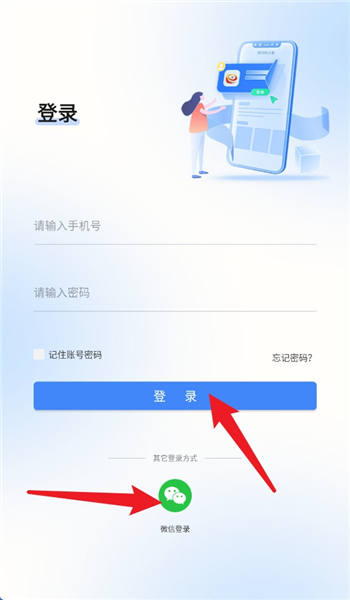 1. 开启应用后,会进入登录界面,在此界面输入手机号码和密码,接着点击“登录”按钮;另外,还能选择通过微信扫码的方式快速登录。