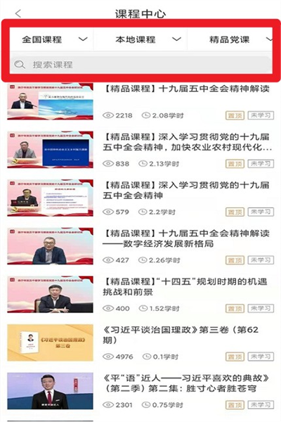 在课程中心页面,你能够依据全国、本地以及精品党课这几类进行筛选浏览,从而便捷地找到所需的学习内容与专题课程。
